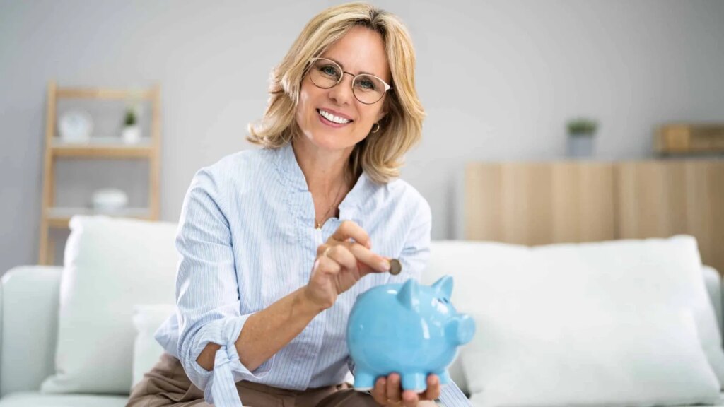 A woman with glasses smiles while placing a coin into a blue piggy bank, seated on a white couch in a living room.