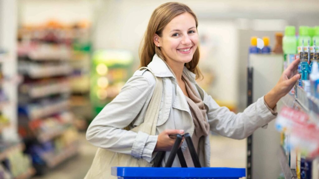 A woman is smiling while shopping in a grocery store, holding a blue basket and reaching for an item on a shelf.