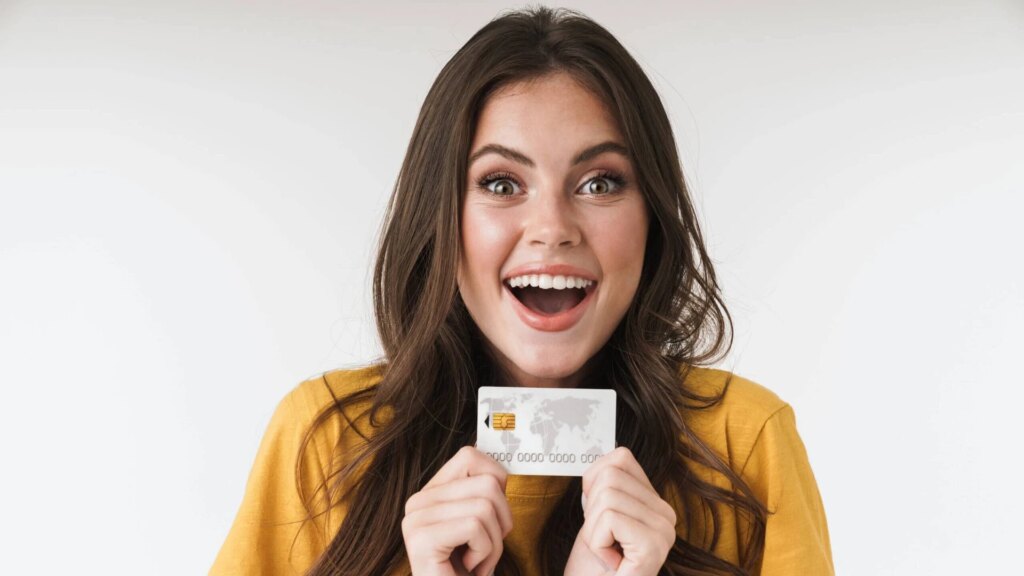 A woman in a yellow shirt holds a credit card, smiling with an excited expression against a plain background, eager to maximize her credit card rewards.