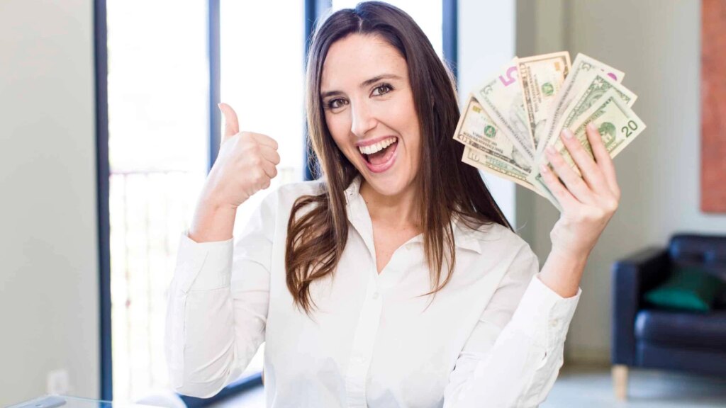 Person in a white shirt smiling, holding a fan of cash in one hand, and giving a thumbs-up with the other, in a bright room.