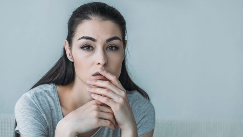A person with long dark hair and a contemplative expression rests their chin on their fingers, wearing a gray shirt against a plain background.