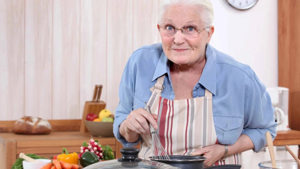 An elderly woman with short white hair, wearing glasses and a striped apron, stands in a kitchen stirring a pot. Vegetables and bread are on the counter behind her. A clock hangs on the wall in the background.