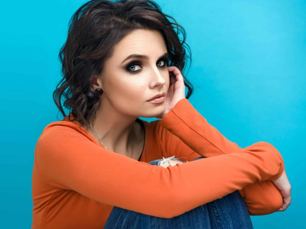 A woman with dark hair and smokey eye makeup looks at the camera, resting her chin on her hand. She wears an orange top and sits against a blue background.