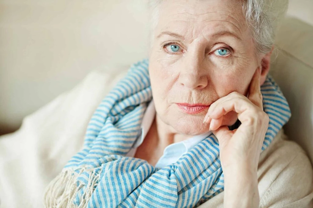An elderly woman with gray hair and a blue sweater looks pensively at the camera, resting her hands against her chin in a brightly lit room.