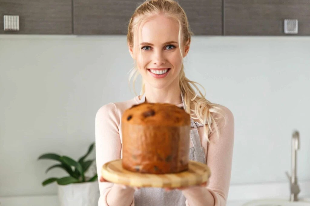 A person in an apron holds a freshly baked panettone on a wooden plate, smiling. A plant is in the background on a kitchen counter.