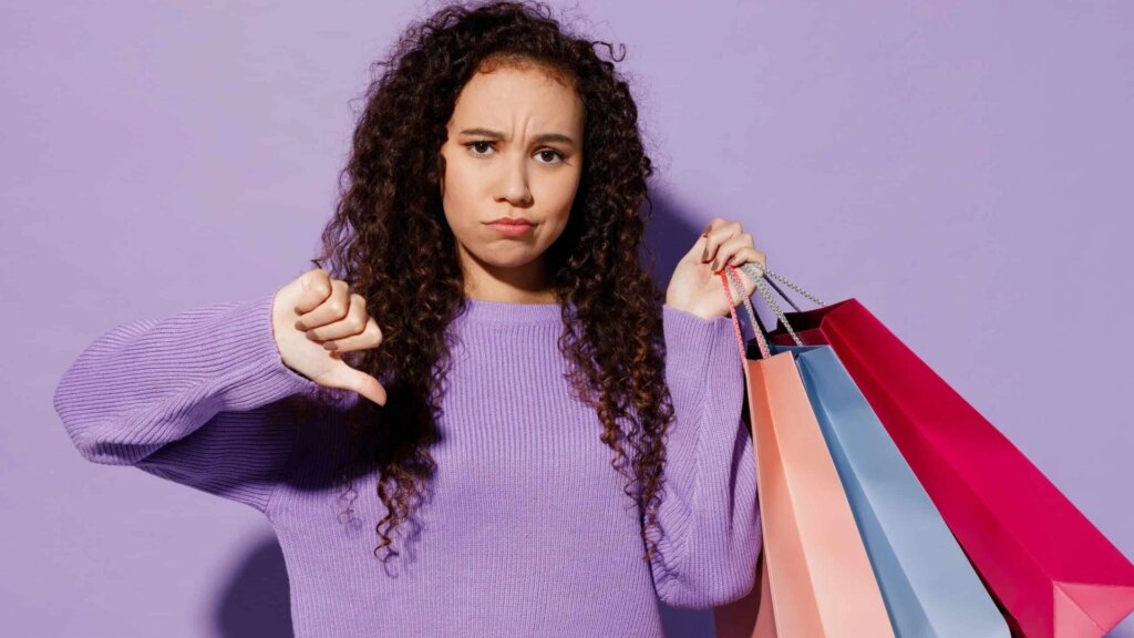 A woman in a purple sweater shows a thumbs-down gesture while holding multiple shopping bags against a light purple background.