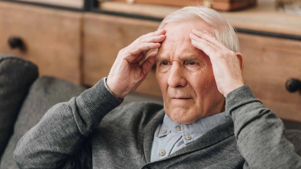 An elderly man sitting on a sofa holds his head with both hands, appearing concerned or distressed, perhaps reflecting on the advice to stop doing these if over 60.