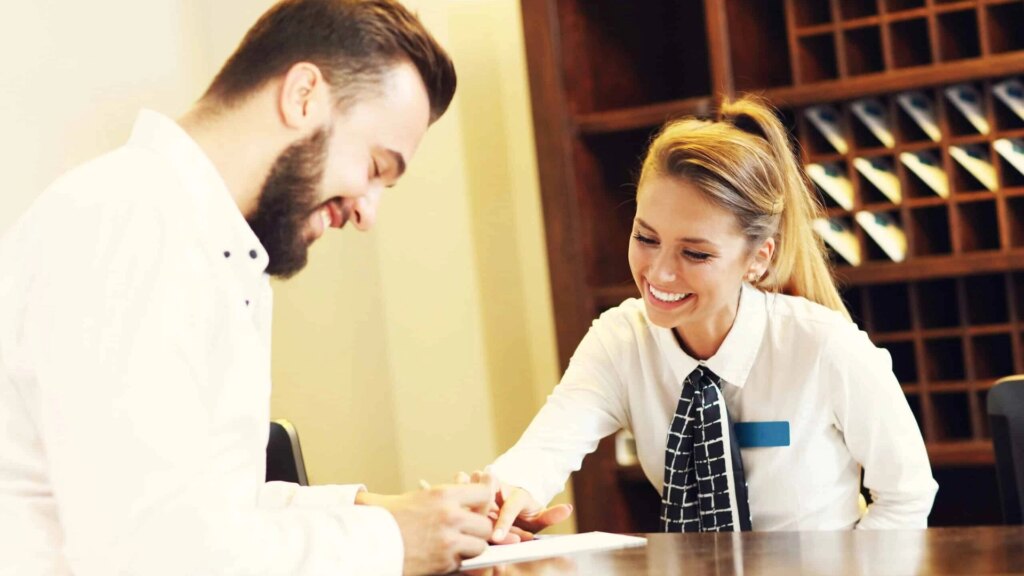 A man is signing a document at a reception counter while a smiling receptionist looks on, providing assistance.