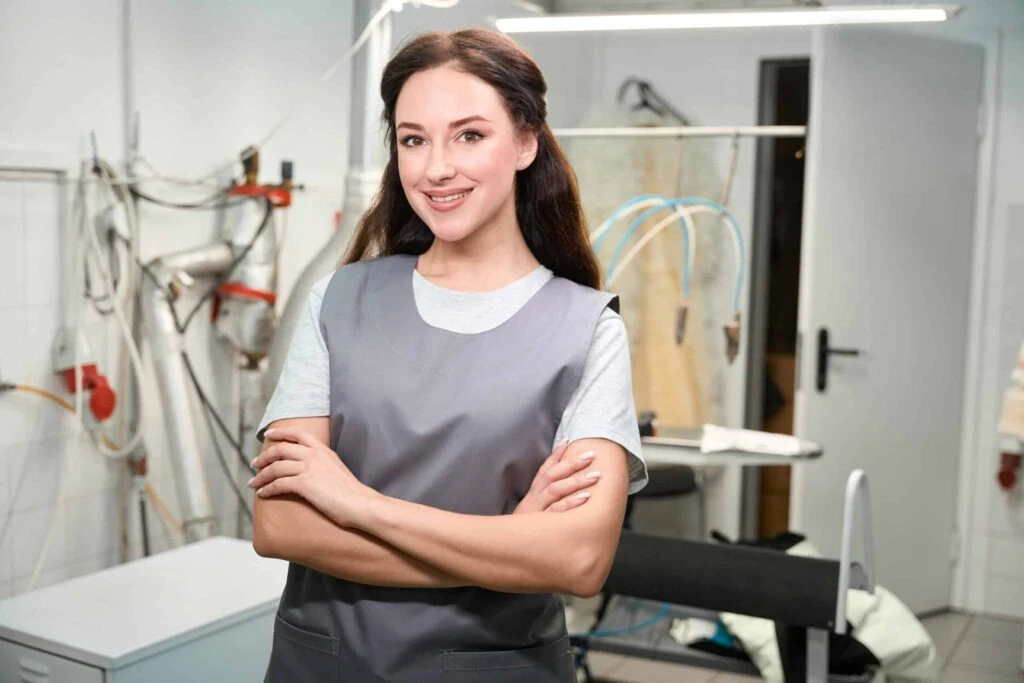 A woman in a work apron smiles while standing with arms crossed in a workshop. Tools and equipment are visible in the background.