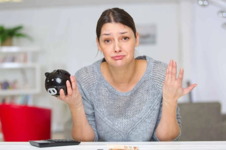 sad young woman with a piggy bank Many people feel stuck with money, living paycheck to paycheck even after hard...