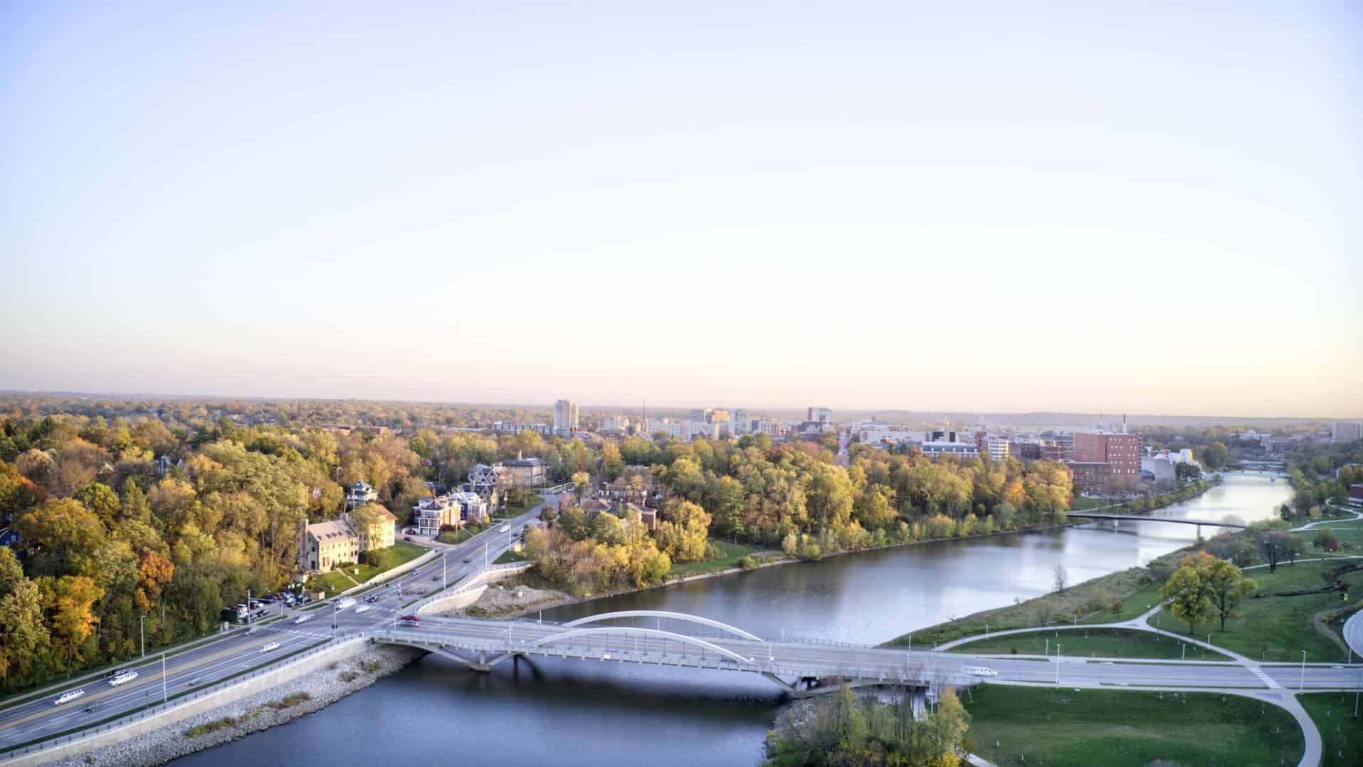 Aerial view of a riverside city showcasing a mix of tree-lined streets, buildings, and a marina with docked boats, set against a backdrop of a broad waterway and a bridge.