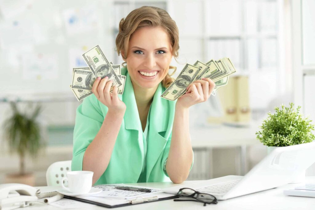 A woman in a green blazer smiles while holding stacks of US dollar bills in both hands in an office setting.